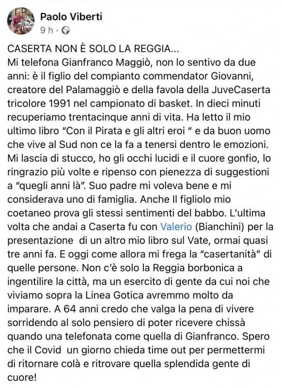 Questo quanto pubblicato sulla pagina facebook dello scrittore e giornalista Paolo Viberti: "CASERTA NON È SOLO LA REGGIA... Mi telefona Gianfranco Maggiò, non lo sentivo da due anni - si legge nella nota -: è il figlio del compianto commendator Giovanni, creatore del Palamaggiò e della favola della JuveCaserta tricolore 1991 nel campionato di basket. In dieci minuti recuperiamo trentacinque anni di vita. Ha letto il mio ultimo libro “Con il Pirata e gli altri eroi“ e da buon uomo che vive al Sud non ce la fa a tenersi dentro le emozioni. Mi lascia di stucco - si legge nella nota -, ho gli occhi lucidi e il cuore gonfio, lo ringrazio più volte e ripenso con pienezza di suggestioni a “quegli anni là”. Suo padre mi voleva bene e mi considerava uno di famiglia. Anche il figliolo mio coetaneo prova gli stessi sentimenti del babbo. L’ultima volta che andai a Caserta fu con Valerio (Bianchini) per la presentazione di un altro mio libro sul Vate, ormai quasi tre anni fa. E oggi come allora mi frega la “casertanità” di quelle persone. Non c’è solo la Reggia borbonica a ingentilire la città - si legge nella nota -, ma un esercito di gente da cui noi che viviamo sopra la Linea Gotica avremmo molto da imparare. A 64 anni credo che valga la pena di vivere sorridendo al solo pensiero di poter ricevere chissà quando una telefonata come quella di Gianfranco. Spero che il Covid un giorno chieda time out per permettermi di ritornare colà e ritrovare quella splendida gente di cuore!"