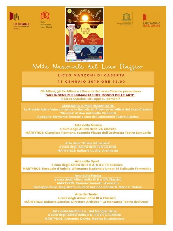 "La modernità della formazione classica è al centro della “Notte Nazionale”- nata da un’idea del Liceo “Gulli e Pennisi” di Acireale - celebrata dal Liceo Classico del Manzoni di Caserta. Una formazione che si snoda attraverso il metodo rigoroso che la sostiene, senza soffocare - si legge nel comunicato stampa - la “genialità” dei protagonisti, e che affonda le radici in quelmirabile patrimonio dell’humanitas che, come diceva Italo Calvino, “persiste come rumore di fondoanche là dove l'attualità più incompatibile fa da padrona”. Questo il senso profondo che la Preside Adele Vairo e gli insegnanti del Manzoni lanceranno l’11 gennaio dalle stanze del Liceo casertano, insiemi agli Allievi, agli ex-Allievi e a tanti protagonisti della Cultura e delle “Arti”, ciascuno una vera e propria “eccellenza”,che hanno accettato diesserne Mártyroi, Testimoni. Sin dalla sua prima edizione, il Liceo Classico del Manzoni - si legge nel comunicato stampa - ha aderito con entusiasmo alla “Notte Nazionale”, mantenendo sempre viva l’idea di non trasformare l'avvenimento in un calderone senza anima, in cui ciascuno mostri quello che sa fare, o, peggio ancora, risolverlo in un’approssimativa o “scolastica” rassegna di esibizioni: per questo motivo, sostenuti dalla Preside, i docenti dell’indirizzo classico ogni anno hanno sempre scelto un tema con al centro la classicità, come occasione di riflessione per i propri ragazzi. E così sarà per l’attuale edizione. In particolare, la scelta di quest’anno è caduta sul mondo del Lavoro, delle “Arti”appunto, e caratterizzata dall’incontro tra i Liceali classici di ieri, ognuno dei quali porta con sé la firma della propria formazione classica,e quelli di oggi: riflessioni, letture, drammatizzazioni a cura degli Allievi del Manzoni e dei propri insegnanti, per gettare il ponte su un domani che, sebbene appaia talvolta incerto e dimentico dei valori fondamentali - si legge nel comunicato stampa - dell’uomo,da questi stessi non potrà mai prescindere, in nessun settore della vita professionale e civile. “Le lucerne che vegliarono le carte dei nostri antichi restano accese ancora, attraverso i millenni, e resteranno.”- Così si esprimeva anni fa il celebre studiosoConcetto Marchesied in nome di questo messaggio si articola la cerimonia del LumenHumanitatis,con cui si illumina e si apre la “Notte” del Manzoni, presieduta, come da tradizione, da don Antonello Giannotti, la cui “strenna” diventa, come successo in passato ed in tutte le occasioni in cui il parroco del Buon Pastore si presenta alla Città, un’occasione di riflessione e di monito per l’intera collettività. Il programma - si legge nel comunicato stampa - prevede una breve esibizione del Laboratorio Teatro Classico, la fucina di attori che quest’anno segna i suoi 10 anni di attività e che continua ariportare consensi di criticanel panorama nazionale, insignito dall’Istituto Nazionale del Dramma Antico di Siracusa quale “Fuoco di Prometeo, ovvero, “ambasciatore di cultura classica sul territorio”; seguirà il mondo delle Arti,con le letture e le contestualizzazioni operate dagli allievi del Liceo Classico,ognuna rappresentata da testimoni, Mártyroi, di eccellenza, tutti ex-liceali classici: –Arte della Musica-: Gianpiero Pannone,Secondo Flauto dell’Orchestra del Teatro San Carlo di Napoli, il primo e ad oggi unico musicista “casertano d’origine” a far parte del prestigiosissimo complesso orchestrale e che ha ascrittoal suo curriculum l’essere - si legge nel comunicato stampa - stato diretto da Maestri quali Riccardo Muti, Zubin Metha o aver suonato con il compianto Severino Gazzelloni, -Arte della Triade Vitruviana–: Raffaele Cutillo,Architetto, prof. universitario, autentico punto di riferimento dell’architettura della città di Caserta, del territorio e nazionale e che vanta esposizioni in tutta Italia e all’estero, da Milano a Graz, da Praga alla Biennale di Venezia; -Arte dello Sport-:Pasquale d’Aniello, Allenatore Nazionale Under 16 Pallavolo Femminile, Campione d’Europa uscente, vincitore della medaglia d’oro agli ultimi Europei a Sofia nel 2017; premiato dall’Amministrazione Comunale di Aversa per i suoi meriti sportivi; – Arte della Parola -:Gennaro Iannotti, Avvocato penalista conosciutissimo in città per le battaglie culturali a difesa della cultura classica, sia, ovviamente, per la sua qualificata attività professionale che lo ha visto protagonista in processi presso i Tribunali in tutto il territorio - si legge nel comunicato stampa - nazionale , da S. Maria C. Vetere a Napoli, Bari, Milano, Roma e Verona; Giuseppe Zullo, Magistrato, Giudice Sezione Penale S. Maria C. Vetere, giovanissimo, di 32 anni, e Testimone d’eccezione di una brillantissima carriera, già da ex-liceale ; - Arte del Teatro -:Roberta Sandias, Direttore Artistico de “La Mansarda – Teatro dell’Orco”, una delle scuole di teatro più brillanti della città, premiata in molti e prestigiosi Festival nazionali e promotrice, insieme al bravissimo attore Maurizio Azzurro, di seminari e studi laboratoriali sulla maschera atellana ; - Arte della Medicina -: Armando D’Orta, Medico Chirurgo, Biologo Nutrizionista, specialista in Scienze dell’Alimentazione, socio - si legge nel comunicato stampa - fondatore della Fondazione Onlus “DD Clinic ResearchInstitute”, più volte invitato come esperto in trasmissioni TV di interesse nazionale, non ultima una sua presenza a “Le Iene”. Le porte del Manzoni saranno aperte dalle 18,00 per consentire alle famiglie dei prossimi allievi di accedere alla Segreteria e per la trasmissione del video mandato a tutti i Licei partecipanti alla “Notte” dal Coordinamento - conclude il comunicato - Nazionale".