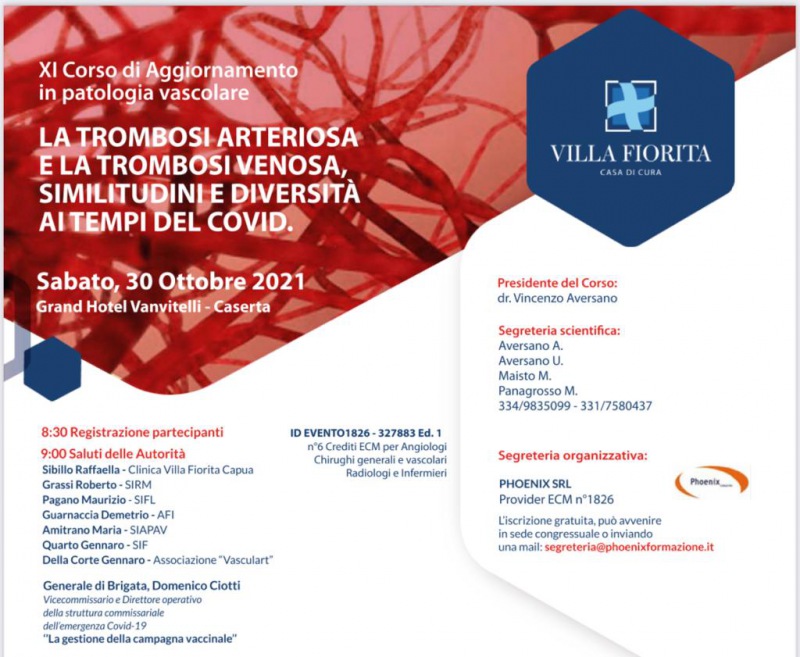 Questo il comunicato stampa diffuso dalla Casa di cura 'Villa Fiorita': "Un confronto aperto tra esperti su casi clinici di pazienti affetti da malattia aterotrombotica e tromboembolica nel “mondo reale”, alla luce dei recenti studi clinici che indicano sempre più tali eventi come fenomeni prodotti da comune etiopatogenesi. È questo l'obiettivo dell'11° Corso di aggiornamento sul tema de "La trombosi arteriosa e la trombosi venosa, similitudini e diversità ai tempi del Covid" in programma per domani (oggi ndr) - si legge nel comunicato - sabato 30, presso il Gran Hotel Vanvitelli di Caserta. Promossa dalla Casa di Cura "Villa Fiorita" di Capua, la giornata di approfondimento si aprirà con i saluti di Raffaella Sibillo, presidente del CdA della clinica capuana, di Roberto Grassi, presidente della Società italiana di radiologia medica e interventistica; di Maurizio Pagano - si legge ancora - presidente della Società Italiana di FleboLinfologia; di Gennaro Della Corte, presidente di Vasculart; di Demetrio Guarnaccia, presidente dell'Associazione Flebologi Italiani, di Maria Amitramo, segretario della Società Italiana di Patologia Vascolare, e di Gennaro Quarto, presidente della Società Italiana di Flebologia, che hanno patrocinato l’evento. L'edizione annuale del corso di aggiornamento sarà incentrata - prosegue il comunicato - sugli effetti del Covid e sulle interrelazioni tra il coronavirus e le trombosi venose e arteriose, da qui l'invito ad intervenire rivolto alla Struttura Commissariale per l'emergenza Covid-19 guidata dal Generale Francesco Paolo Figliuolo, che sarà presente con il vice commissario straordinario e direttore operativo per l'attuazione e il coordinamento delle misure occorrenti per il contenimento e contrasto dell'emergenza epidemiologica, Generale di Brigata Domenico Ciotti, che illustrerà la gestione della campagna vaccinale. I lavori - si legge ancora - saranno introdotti dal presidente del corso e responsabile dell'unità di chirurgia vascolare di Villa Fiorita, Aversano, con il tema "Trombosi arteriosa e venosa. Due facce della stessa medaglia?", con a seguire le diverse sessioni cui parteciperanno i diversi medici ed esperti che commenteranno ed illustreranno i casi clinici, fra i quali Del Guercio, Nardi, Guarnaccia, Massa Saluzzo, Scotto di Uccio, Bernardo, MarKabaoui, Amitrano, Coletta Carandente - conclude il comunicato - Natale Capasso, Schiano, D'Adamo, Attilio, De Santis, Follica, Acernese, Scevola, Foggia e Scevola".