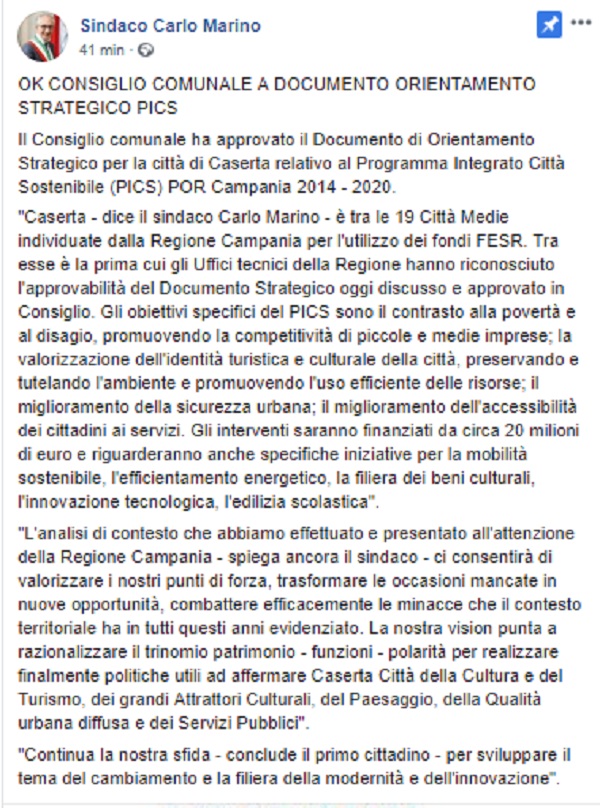 Questo il post pubblicato sulla pagina fb ufficiale del Sindaco di Caserta Carlo Marino.
