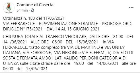 Questo il post pubblicato sulla pagina Facebook 'Comune di Caserta': "Ordinanza n. 183 del 11/06/2021 VIA FERRARECCE - RIPAVIMENTAZIONE STRADALE - PROROGA ORD. DIRIG.LE N°175/2021 - DAL 14 AL 15 GIUGNO 2021 CHIUSURA TOTALE AL TRAFFICO VEICOLARE, DALLE ORE 21:00 DEL 14 /06/2021 ALLE ORE 06:00 DEL 15/06/2021 in VIA FERRARECCE - si legge nel post - tratto compreso tra VIA DE MARTINO e VIA UNITA’ ITALIANA, VIA FORGIONE, VIA NERONI e VIA E. FERMI; b) DIVIETO DI SOSTA E FERMATA AMBO I LATI VALIDO PER OGNI CATEGORIA DI UTENZA sulle citate strade dalle ore 19:00 del 14/06/2021 alle ore 06:00 del 15/06/2021".