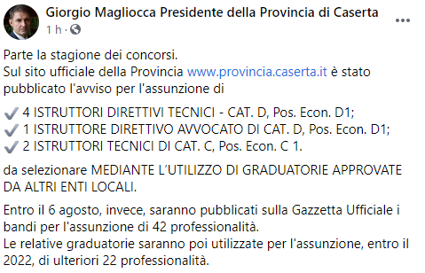 Questo parte del post pubblicato sulla sua pagina Facebook dal Presidente della Provincia di Caserta Giorgio Magliocca: "Parte la stagione dei concorsi. Sul sito ufficiale della Provincia (...) è stato pubblicato l'avviso per l'assunzione - si legge nel post - di 4 ISTRUTTORI DIRETTIVI TECNICI - CAT. D, Pos. Econ. D1; 1 ISTRUTTORE DIRETTIVO AVVOCATO DI CAT. D, Pos. Econ. D1; 2 ISTRUTTORI TECNICI DI CAT. C, Pos. Econ. C 1. da selezionare MEDIANTE L’UTILIZZO DI GRADUATORIE APPROVATE DA ALTRI ENTI LOCALI. Entro il 6 agosto, invece, saranno pubblicati sulla Gazzetta Ufficiale - prosegue il post - i bandi per l'assunzione di 42 professionalità. Le relative graduatorie saranno poi utilizzate per l'assunzione, entro il 2022, di ulteriori 22 professionalità".