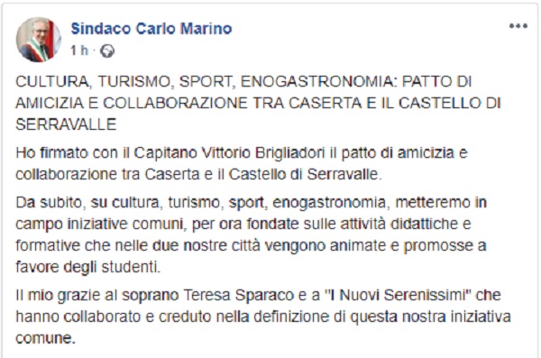 Questo il post pubblicato sulla pagina fb ufficiale del Sindaco di Caserta Carlo Marino.