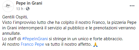 Questo il post pubblicato ieri sera sulla pagina Facebook 'Pepe in grani': "Gentili Ospiti. Visto l’improvviso lutto che ha colpito il nostro Franco - si legge nel post - la pizzeria Pepe in Grani interromperà il servizio al pubblico e le prenotazioni verranno annullate.