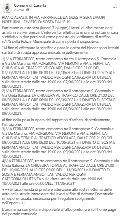 Questo il post pubblicato sulla pagina Facebook del Comune di Caserta: "Piano asfalti in Via Ferrarecce. Da questa sera lavori notturni, divieto di sosta dalle 19. Partiranno questa sera (lunedì 7 giugno) i lavori di rifacimento degli asfalti in via Ferrarecce, L’intervento, effettuato in orario notturno, sarà suddiviso - si legge nel post - in due parti così come previsto dall’ordinanza di traffico n.175 della Polizia Municipale di cui si riporta il dispositivo. “Al fine di effettuare la scarifica e posa in opera del binder sono istituiti sui tratti di strada appresso indicati, rispettivamente: 1) VIA FERRARECCE, tratto compreso tra tra il sottopasso S. Commaia e Via De Martino, VIA FORGIONE, VIA NERONI e VIA E. FERMI, LA CHIUSURA AL TRAFFICO VEICOLARE, DALLE ORE 21:00 DEL 07/06/2021 ALLE ORE 06:00 DEL 08/06/2021 e il DIVIETO DI SOSTA E FERMATA AMBO I LATI - prosegue il post - VALIDO PER OGNI CATEGORIA DI UTENZA sulle citate strade dalle ore 19:00 del 07/06/2021 alle ore 06:00 del 08/06/2021; 2) VIA FERRARECCE, tratto compreso tra il sottopasso S. Commaia e Via Unità Italiana, LA CHIUSURA AL TRAFFICO DALLE ORE 21:00 DEL 08/06/2021 ALLE ORE 06:00 DEL 09/06/2021 e il DIVIETO DI SOSTA E FERMATA AMBO I LATI VALIDO PER OGNI CATEGORIA DI UTENZA - si legge ancora nel post - sulla citata strada dalle ore 19:00 del 08/06/2021 alle ore 06:00 del 09/06/2021; al fine della posa in opera del tappetino d’asfalto, rispettivamente, l’istituzione: 3) VIA FERRARECCE, tratto compreso tra il sottopasso S. Commaia e Via De Martino, VIA FORGIONE, VIA NERONI e VIA E. FERMI, LA CHIUSURA TOTALE AL TRAFFICO VEICOLARE - si legge ancora - DALLE ORE 21:00 DEL 09/06/2021 ALLE ORE 06:00 DEL 10/06/2021 e il DIVIETO DI SOSTA E FERMATA AMBO I LATI VALIDO PER OGNI CATEGORIA DI UTENZA sulle citate strade dalle ore 19:00 del 09/06/2021 alle ore 06:00 del 10/06/2021; 4)VIA FERRARECCE, tratto compreso tra il sottopasso S. Commaia e Via Unità Italiana, LA CHIUSURA TOTALE AL TRAFFICO DALLE ORE 21:00 DEL 10/06/2021 ALLE ORE 06:00 DELL’ 11/06/2021 e il DIVIETO DI SOSTA E FERMATA AMBO I LATI VALIDO PER OGNI CATEGORIA - si legge nel post - DI UTENZA sulla citata strada dalle ore 19:00 del 10/06/2021 alle ore 06:00 DELL ’11/06/2021”. Si raccomanda - prosegue il post - di prestare attenzione alla sosta notturna delle auto nelle strade interessare dai lavori al fine di evitarne l’eventuale rimozione forzata, necessaria per il regolare svolgimento dell’opera