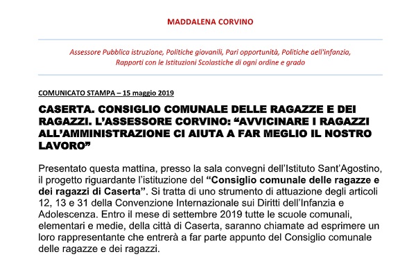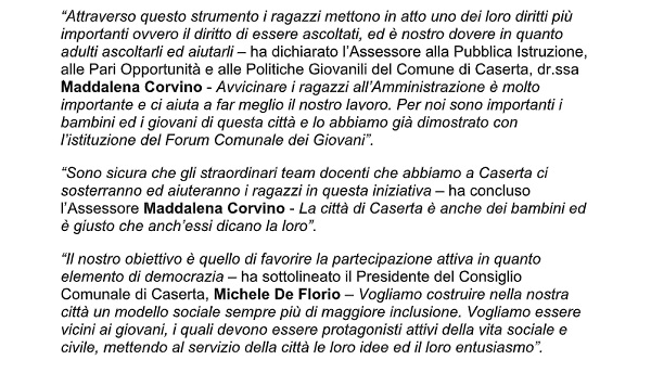CASERTA. Presentato questa mattina il progetto del 'Consiglio Comunale delle ragazze e dei ragazzi'