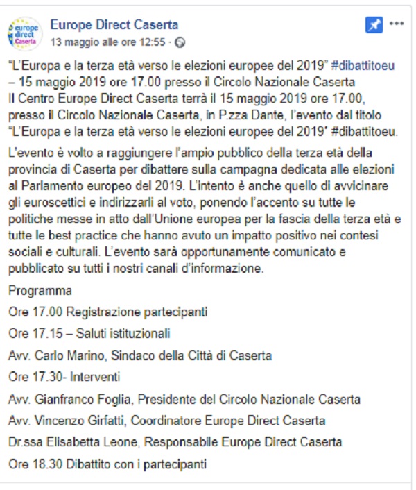 Questo il post pubblicato sulla pagina fb 'Europe Direct Caserta'.