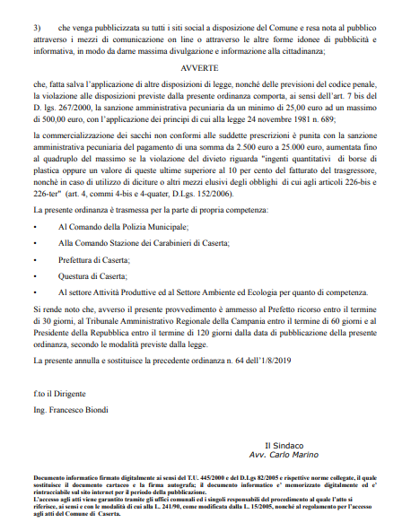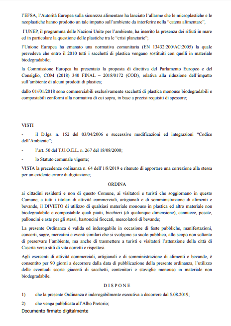 Di seguito, l'Ordinanza di divieto dell'utilizzo di stoviglie e oggetti monouso non biodegradabili, inviataci dal portavoce del Sindaco di Caserta, Carlo Marino.