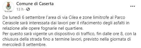 Questo il post pubblicato sulla pagina Facebook 'Comune di Caserta': "Da lunedì 6 settembre l'area di via Cilea e zone limitrofe al Parco Cerasole sarà interessata dai lavori per il rifacimento degli asfalti in relazione alle opere fognarie nel quartiere. Per questo - si legge nel post - sarà vigente un dispositivo di traffico, fin dalle ore 8, con la chiusura della strada fino a termine lavori, previsto nella giornata di mercoledì 8 settembre".