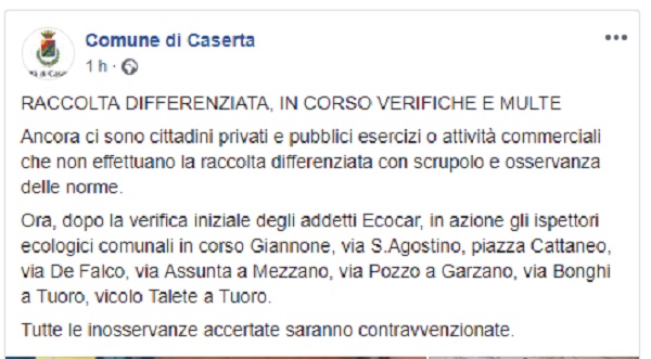 Questo il post pubblicato sulla pagina fb ufficiale del Comune di Caserta.