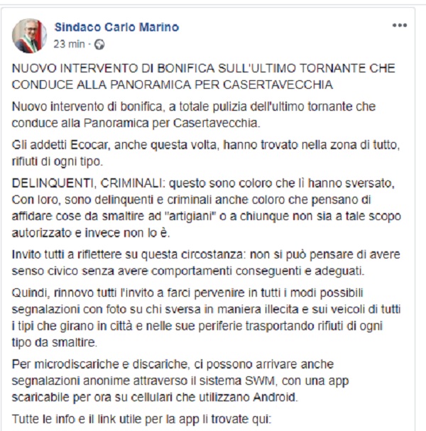 Questo il post pubblicato sulla pagina fb ufficiale del Sindaco di Caserta Carlo Marino.