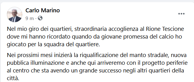 Questo parte del post pubblicato sulla pagina Facebook del sindaco di Caserta, Carlo Marino: "Nel mio giro dei quartieri, straordinaria accoglienza al Rione Tescione dove mi hanno ricordato quando da giovane promessa del calcio ho giocato per la squadra del quartiere. Nei prossimi mesi - si legge nel post - inizierà la riqualificazione del manto stradale, nuova pubblica illuminazione e anche qui arriveremo con il progetto periferie al centro che sta avendo un grande successo negli altri quartieri della città - conclude".