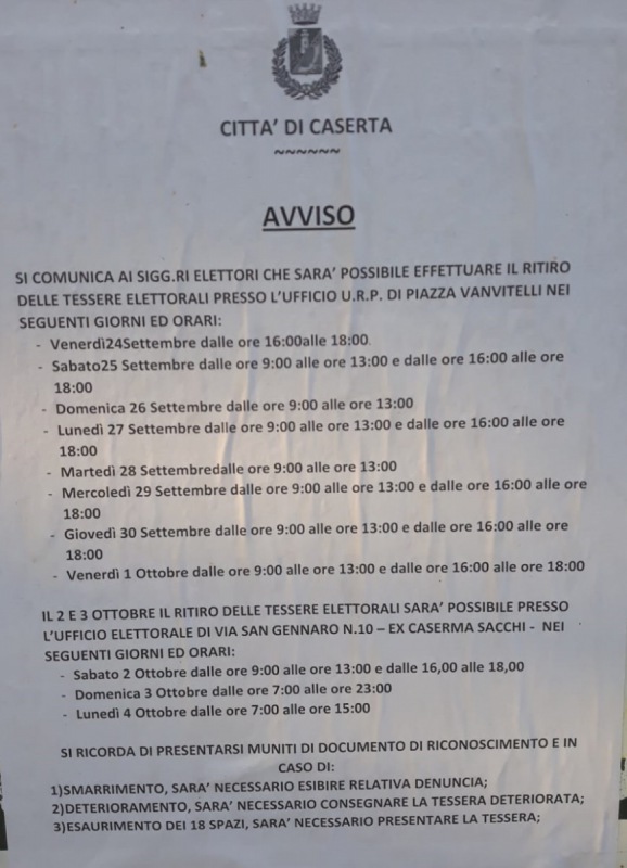 Questo l'avviso diffuso dal Comune di Caserta