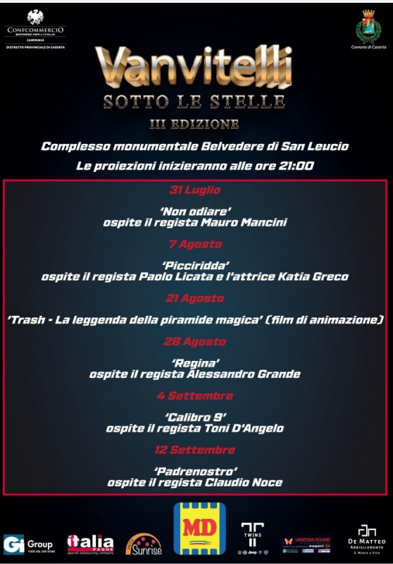 Questo il comuicato stampa diffuso da Confcommercio Caserta: "‘Vanvitelli sotto le stelle’, si riparte. La rassegna di cinema all’aperto ideata da Confcommercio Caserta tornerà infatti ad animare anche quest’anno l’estate di chi resta in città. Sei serate di grande cinema, tutte ad ingresso gratuito, in programma dal 31 luglio al 12 settembre - si legge nel comunicato - nello splendido scenario del Real Belvedere di San Leucio. Giunta alla terza edizione, la manifestazione - patrocinata dal Comunedi Caserta – si candida a diventare dunque un vero e proprio Festival cinematografico con ospiti d’eccezione, riconoscimenti, premi e tante sorprese.Si parte sabato 31 luglio alle ore 20,30 con una serata evento che sarà presentata da Francesco Massarelli, direttore artistico della rassegna. Saranno presenti il presidente di Confcommercio Caserta, Lucio Sindaco, il sindaco di Caserta, Carlo Marino, l’assessore agli eventi Emiliano Casale. Il primo film in cartellone è‘Non odiare’. Ospite della serata il regista Mauro Mancini che incontrerà il pubblico subito dopo la proiezione. Una storia vera, quella interpretata da Alessandro Gassmann, qui - prosegue il comunicato - nel suo ruolo forse più bello e viscerale. Candidato a 4 Nastri d’Argento e 3 David di Donatello, il film è stato presentato lo scorso anno anche alla Settimana internazionale della Critica della Mostra del Cinema di Venezia. Racconta la storia di un medico ebreo che trovandosi di fronte al dilemma di salvare o meno un uomo che ha appena subito un incidente stradale, decide di abbandonarlo al suo destino quando scopre che ha una svastica tatuata in più parti del corpo. L'uomo - si legge ancora nel comunicato - sarà però dilaniato dai sensi di colpa, e cercherà di aiutare quel che resta della famiglia dell'uomo per rimediare al suo conflitto morale. Nel corso della serata di sabato 31 luglio ci saranno però anche altre sorprese cinematografiche tutte da scoprire. Secondo appuntamento sabato 7 agosto con il film ‘Picciridda’ tratto dall’omonimo romanzo di Catena Fiorello. Sul palco del Belvedere per l’occasione ci saranno il regista Paolo Licata e l’attrice Katia Greco. Una pellicola che racconta - prosegue ancora il comunicato - il fenomeno dell’emigrazione passiva negli anni Sessanta, ovvero quella di chi è rimasto nel luogo natale e deve fare i conti con il senso di abbandono e l’impossibilità di comunicare con i propri cari partiti. La rassegna proseguirà sabato 21 agosto con il cartoon ‘Trash – La leggenda della piramide magica’, opera prima di Luca della Grotta e Francesco Dafano che ambientano le loro creature di animazione in luoghi reali per dare vita ad una storia tenera e ispiratrice di riscatto che passa attraverso il riutilizzo dei rifiuti. Sabato 28 agosto riflettori accesi su ‘Regina’, liberamente ispirato a ‘Il complesso di Telemaco’ - prosegue la nota - di Massimo Recalcati, con Francesco Montanari e Ginevra Francesconi. Ospite della serata sarà il regista Alessandro Grande. Presentato al Torino Film Festival, ‘Regina’ ha ottenuto anche una candidatura ai Nastri d’Argento. Una storia di formazione che, per una volta, vede il personaggio adulto più bisognoso di diventare grande di quello adolescente. Altro appuntamento - prosegue il comunicato - interessante quello di sabato 4 settembre con il regista Tony D’Angelo che porterà al Belvedere di San Leucio il suo ultimo lavoro ‘Calibro 9’ interpretato da Marco Bocci, KseniaRappoport, Barbara Bouchet, Michele Placido e Alessio Boni. Un affresco impietoso sulla ndrangheta, fra le più influenti organizzazioni criminali al mondo, e soprattutto un omaggio a ‘Milano Calibro 9’, che ha fatto epoca nel 1972 e del quale questo film rappresenta il sequel. Gran finale il 12 settembre con ‘Padrenostro’ del regista Claudio Noce che incontrerà il pubblico casertano. Il film premiato a Venezia è un bellissimo e straziante ritratto di un rapporto padre-figlio. Con un magistrale - prosegue il comunicato - Pierfrancesco Favino che per questa interpretazione ha ottenuto la Coppa Volpi. Tutte le proiezioni inizieranno alle ore 21,00.I biglietti per assistere alle proiezioni gratuite potranno essere ritirati a partire da martedì pomeriggio 27 luglio nei punti vendita dei partner della rassegna e precisamente nei supermercati MD di San Nicola la Strada, Casagiove, Tredici e Curti, da Vanessa Sound in via Tescione a Caserta, alla pizzeria Sunrise - si legge ancora - di via Roma a Caserta, alla concessionaria Twins Volkswagen di Marcianise, al negozio di abbigliamento De Matteo uomo di Santa Maria a Vico.Partner della rassegna anche le società Italia Paghe eGi Group".