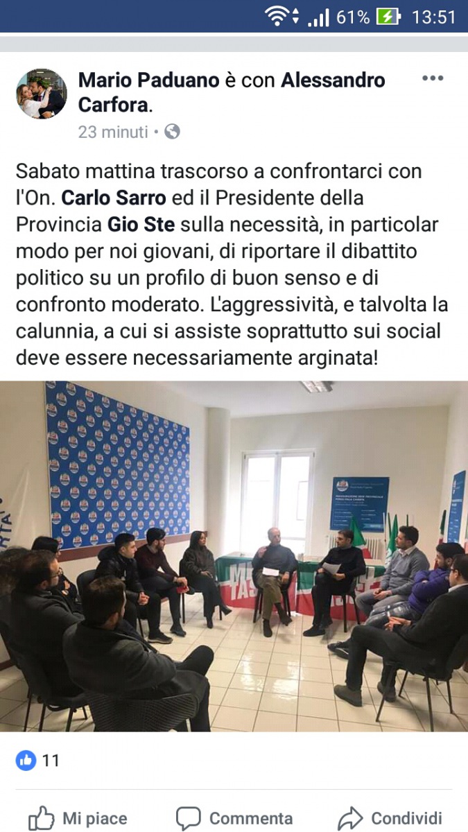 Il coordinatore provinciale dei giovani Forza Italia Mario Paduano ha commentato con soddisfazione sul proprio profilo Fb l'incontro che ha avuto questa mattina con i "senatori" del partito.