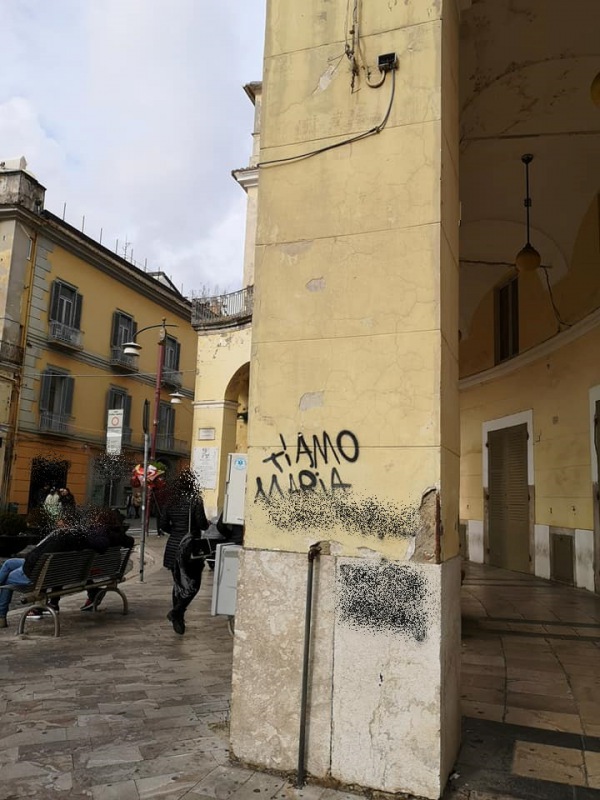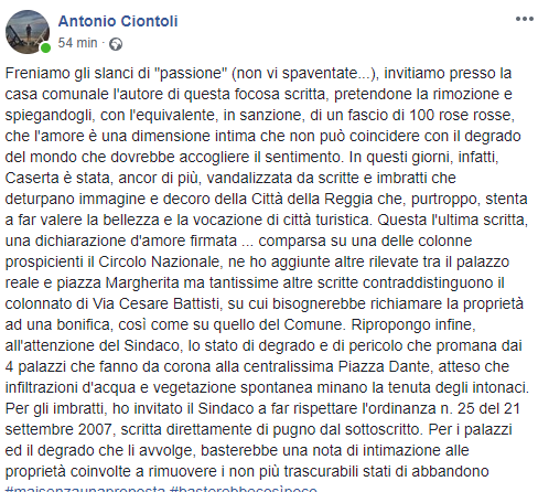"Freniamo gli slanci di "passione" (non vi spaventate...), invitiamo presso la casa comunale l'autore di questa focosa scritta, pretendone la rimozione e spiegandogli, con l'equivalente, in sanzione, di un fascio di 100 rose rosse, che l'amore è una dimensione intima che non può coincidere con il degrado del mondo che dovrebbe accogliere il sentimento. In questi giorni, infatti, Caserta è stata, ancor di più, vandalizzata da scritte e imbratti che deturpano immagine e decoro della Città della Reggia che, purtroppo, stenta a far valere la bellezza e la vocazione di città turistica. Questa l'ultima scritta, una dichiarazione d'amore firmata ... comparsa su una delle colonne prospicienti il Circolo Nazionale, ne ho aggiunte altre rilevate tra il palazzo reale e piazza Margherita ma tantissime altre scritte contraddistinguono il colonnato di Via Cesare Battisti, su cui bisognerebbe richiamare la proprietà ad una bonifica, così come su quello del Comune. Ripropongo infine, all'attenzione del Sindaco, lo stato di degrado e di pericolo che promana dai 4 palazzi che fanno da corona alla centralissima Piazza Dante, atteso che infiltrazioni d'acqua e vegetazione spontanea minano la tenuta degli intonaci. Per gli imbratti, ho invitato il Sindaco a far rispettare l'ordinanza n. 25 del 21 settembre 2007, scritta direttamente di pugno dal sottoscritto. Per i palazzi ed il degrado che li avvolge, basterebbe una nota di intimazione alle proprietà coinvolte a rimuovere i non più trascurabili stati di abbandono".
