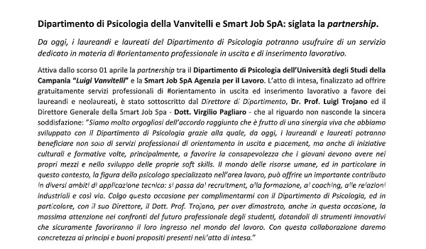 CASERTA. Siglata la partnership tra il Dipartimento di Psicologia della Vanvitelli e la Smart Job Spa