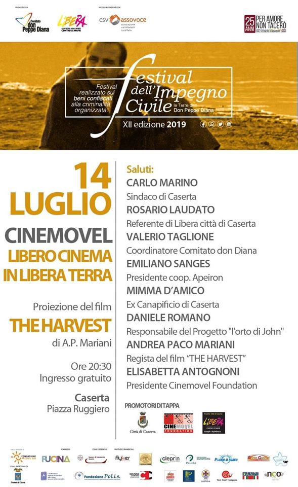 Il Festival dell'Impegno Civile, realizzato sui beni confiscati alla criminalità organizzata, questa sera farà tappa a Caserta a Piazza Ruggiero con la proiezione gratuita alle 20:30 del film "The Harvest", diretto da A.P. Mariani. L'evento è organizzato dalla fondazione Cinemovel, ora alla quattordicesima edizione di "Libero Cinema in Libera Terra", il festival di cinema itinerante contro le mafie.