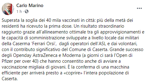 Questo il post pubblicato sulla sua pagina Facebook dal Sindaco di Caserta Carlo Marino: "Superata la soglia dei 40 mila vaccinati in città: più della metà dei residenti ha ricevuto la prima dose. Un risultato straordinario raggiunto grazie all’allineamento ottimale tra gli approvvigionamenti e le capacità - si legge nel post - di somministrazione sviluppate a livello locale dai militari della Caserma ‘Ferrari Orsi’, dagli operatori dell’ASL e dai volontari, con il contributo significativo del Comune di Caserta. Grande successo degli Openday AstraZeneca e Moderna (a giorni ci sarà l'Open di Pfizer per over 40) che hanno consentito - prosegue il post - anche di avviare a vaccinazione migliaia di giovani. È la conferma di una macchina efficiente per arriverà presto a «coprire» l’intera popolazione di Caserta".
