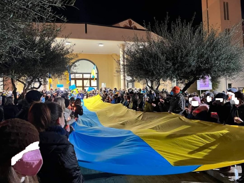 'No alla guerra' in Ucraina: lo hanno detto con la preghiera ed i gesti le tantissime persone che ieri si sono recate alla parrocchia Buon Pastore di Caserta alle 18.30 per partecipare alla Santa Messa celebrata da don Antonello Giannotti. Sul sagrato della chiesa è stata dispiegata una lunga bandiera ucraina che ha sventolato sostenuta dai fedeli. Un segno di vicinanza al popolo attaccato dai militari russi, rappresentato alla messa anche da Padre Igor, cappellano degli ucraini in Italia.