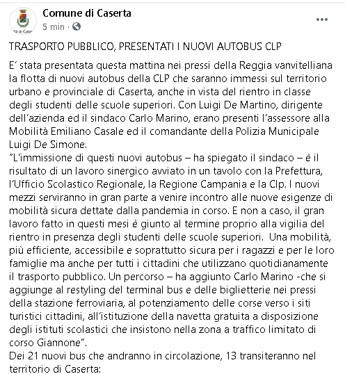 E’ stata presentata questa mattina nei pressi della Reggia vanvitelliana la flotta di nuovi autobus della CLP che saranno immessi sul territorio urbano e provinciale di Caserta, anche in vista del rientro in classe degli studenti delle scuole superiori. Con Luigi De Martino, dirigente dell’azienda ed il sindaco Carlo Marino, erano presenti l’assessore alla Mobilità Emiliano Casale ed il comandante della Polizia Municipale Luigi De Simone. “L’immissione di questi nuovi autobus – ha spiegato il sindaco – è il risultato di un lavoro sinergico avviato in un tavolo con la Prefettura, l’Ufficio Scolastico Regionale, la Regione Campania e la Clp. I nuovi mezzi serviranno in gran parte a venire incontro alle nuove esigenze di mobilità sicura dettate dalla pandemia in corso. E non a caso, il gran lavoro fatto in questi mesi è giunto al termine proprio alla vigilia del rientro in presenza degli studenti delle scuole superiori. Una mobilità, più efficiente, accessibile e soprattutto sicura per i ragazzi e per le loro famiglie ma anche per tutti i cittadini che utilizzano quotidianamente il trasporto pubblico. Un percorso – ha aggiunto Carlo Marino -che si aggiunge al restyling del terminal bus e delle biglietterie nei pressi della stazione ferroviaria, al potenziamento delle corse verso i siti turistici cittadini, all’istituzione della navetta gratuita a disposizione degli istituti scolastici che insistono nella zona a traffico limitato di corso Giannone”.