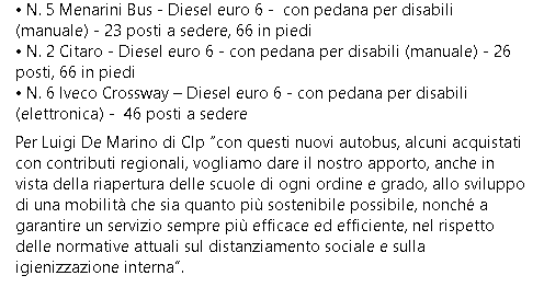 Per Luigi De Marino di Clp “con questi nuovi autobus, alcuni acquistati con contributi regionali, vogliamo dare il nostro apporto, anche in vista della riapertura delle scuole di ogni ordine e grado, allo sviluppo di una mobilità che sia quanto più sostenibile possibile, nonché a garantire un servizio sempre più efficace ed efficiente, nel rispetto delle normative attuali sul distanziamento sociale e sulla igienizzazione interna”.