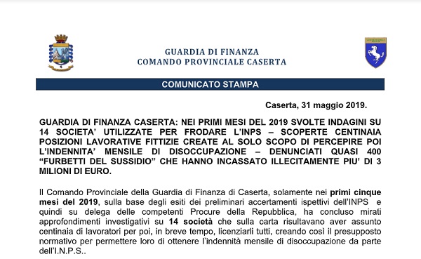 Questo il comunicato inviatoci dal Comando Provinciale della Guardia di Finanza di Caserta.