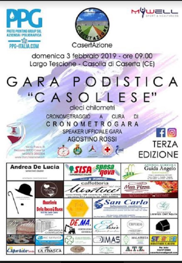 "Tutto pronto a Caserta - si legge nel comunicato - per il via della terza edizione della Gara Podistica Casollese, promossa e organizzata da Casertazione, il cui via è previsto per domenica 3 febbraio, con i preliminari e la partenza fissati tra le ore 8.30 e le ore 9.00 in largo Tescione a Casolla.