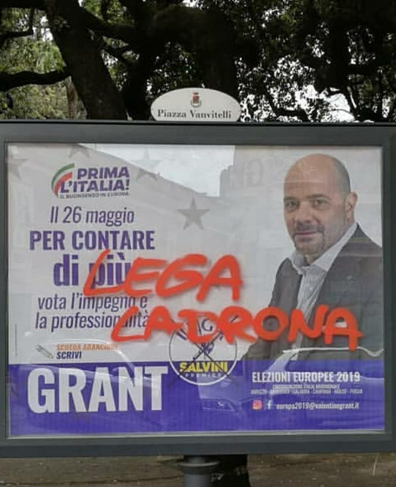 Vandalizzato un manifesto elettorale di Valentino Grant, candidato della Lega alle prossime elezioni europee. Qui siamo in piazza Vanvitelli