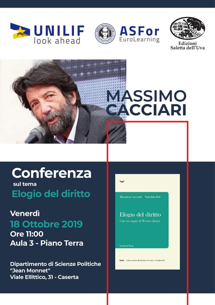 Venerdì 18 ottobre, alle ore 11, presso il Dipartimento di Scienze Politiche "Jean Monnet" sito in Viale Ellittico 31 a Caserta, nell'aula 3 del piano terra, si terrà la conferenza "Elogio del diritto" con Massimo Cacciari.