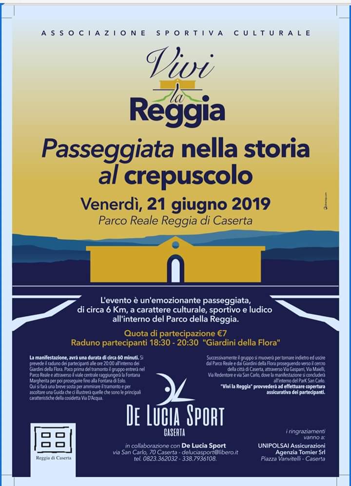 Venerdì 21 giugno 2019, al Parco Reale della Reggia di Caserta, si terrà la passeggiata nella storia al crepuscolo, una emozionante camminata lunga 6 km con finalità culturali, sportive e ludiche nella splendida cornice dei giardini reali. L'appuntamento è alle 18:30 - 20:30 ai "Giardini della Flora".