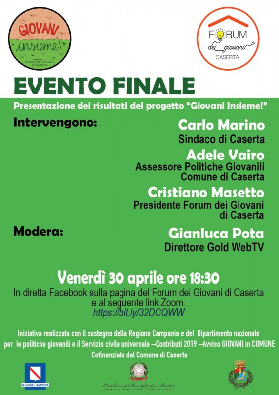 Questa la nota stampa diffusa dal Comune di Caserta: "Venerdì 30 aprile alle ore 18:30 si terrà in diretta Facebook (sulla pagina del Forum dei Giovani di Caserta) e sulla piattaforma Zoom l’evento finale per la chiusura del progetto del Forum dei Giovani di Caserta “Giovani Insieme!”. Il progetto - si legge nel comunicato - realizzato con il sostegno della Regione Campania e del Dipartimento nazionale per le politiche giovanili e il Servizio civile universale –Contributi 2019 –Avviso GIOVANI in COMUNE e cofinanziato dal Comune di Caserta, terminerà le proprie attività, infatti, proprio venerdì 30 aprile. Il progetto, iniziato nel luglio 2020 ha visto la realizzazione di numerose attività - prosegue il comunicato - suddivise in tre azioni principali: Sensibilizzazione sulle tematiche di cittadinanza attiva, Coinvolgimento attivo e scoperta degli aspetti meno conosciuti del territorio, Aggregazione permanente. Le iniziative svolte hanno visto il coinvolgimento di numerose personalità tra cui docenti universitari, esponenti di realtà del Terzo Settore, professionisti ed esperti dei differenti argomenti trattati. Interverranno all’evento - si legge ancora nella nota - il Sindaco di Caserta Carlo Marino, l’Assessore alle Politiche Giovanili Adele Vairo e il Presidente del Forum dei Giovani di Caserta Cristiano Masetto. L’incontro, che sarà moderato da Gianluca Pota, direttore di Gold WebTV, sarà un’occasione - prosegue il comunicato - per tirare le somme alla fine del progetto e portare a conoscenza dei destinatari e degli stakeholder quelli che sono stati i risultati e gli output prodotti, derivanti dall’ideazione e dalla messa in opera delle attività progettuali".