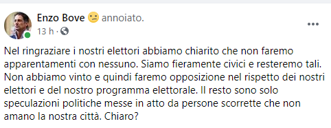 Questo il post pubblicato sulla sua pagina Facebook dal leader del Movimento Città Futura Enzo Bove: "Nel ringraziare i nostri elettori abbiamo chiarito che non faremo apparentamenti con nessuno. Siamo fieramente civici - si legge nel post - e resteremo tali. Non abbiamo vinto e quindi faremo opposizione nel rispetto dei nostri elettori e del nostro programma elettorale. Il resto sono solo speculazioni politiche messe in atto - conclude il post - da persone scorrette che non amano la nostra città. Chiaro?".