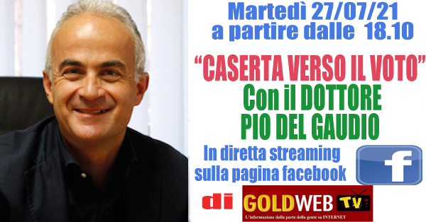 Non perdete domani (martedì 27 luglio) la diretta streaming sulla nostra pagina facebook 'gold webtv Basket e Sport' e non sulla pagina 'Gold webtv' con il già Sindaco di Caserta e Dottore Commercialista Pio del Gaudio, nuovamente candidato alla poltrona di Primo Cittadino del comune capoluogo di 'Terra di Lavoro'. Con lui, a patire dalle ore 18.10, scopriremo i motivi per i quali ha deciso di ricandidarsi e scopriremo il programma politico alla luce anche dell'accordo che verrà stipulato in queste ore con il Movimento Città Futura dell'ex consigliere Consigliere Enzo Bove. Inoltre affronteremo le tematiche relative allo sviluppo ed al miglioramento di Caserta. E infine il Dottore Del Gaudio risponderà alle domande che ci invierete durante la diretta.