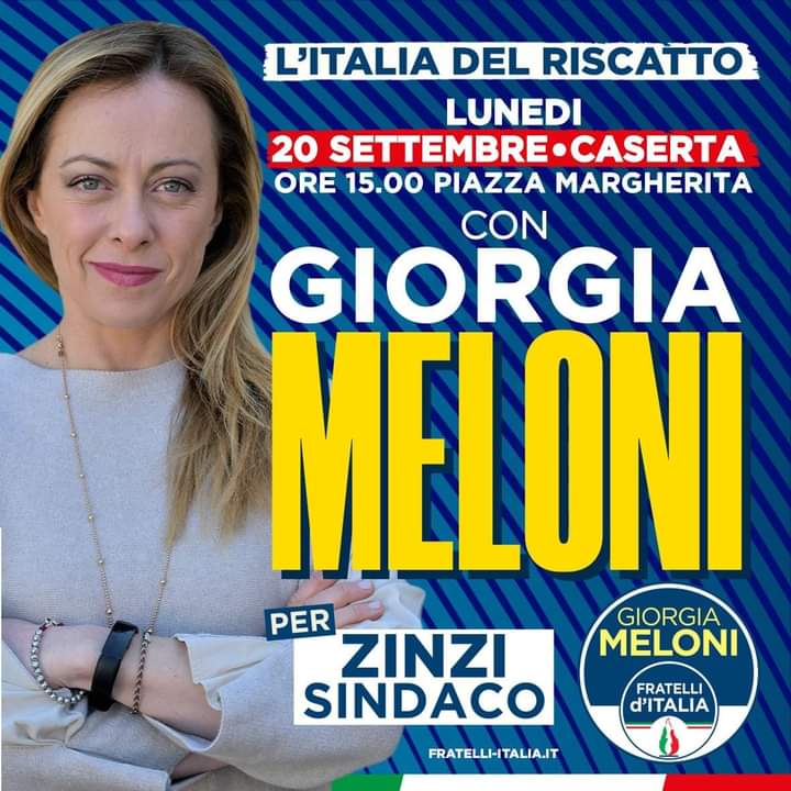 Domani alle 15 l'Onorevole Giorgia Meloni, guida di Fratelli d'Italia, sarà in piazza Margherita a Caserta per confermare il suo sostegno al candidato Sindaco di Caserta Gianpiero Zinzi.