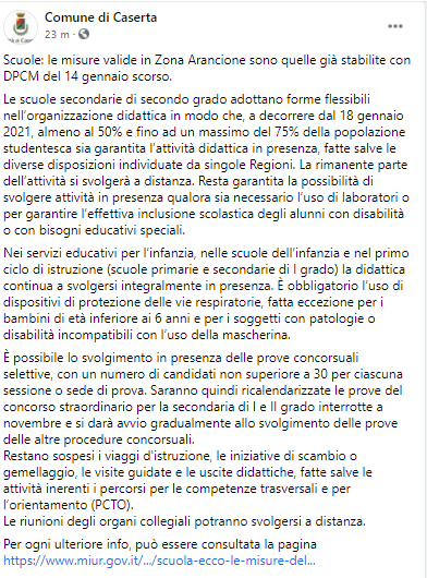 Questo parte del post pubblicato dal Comune di Caserta sulla sua pagina Facebook: "Scuole: le misure valide in Zona Arancione sono quelle già stabilite con DPCM del 14 gennaio scorso. Le scuole secondarie di secondo grado adottano forme flessibili nell’organizzazione didattica in modo che, a decorrere dal 18 gennaio 2021, almeno al 50% e fino ad un massimo del 75% della popolazione studentesca sia garantita l’attività didattica in presenza, fatte salve - continua il post - le diverse disposizioni individuate da singole Regioni. La rimanente parte dell’attività si svolgerà a distanza. Resta garantita la possibilità di svolgere attività in presenza qualora sia necessario l’uso di laboratori o per garantire l’effettiva inclusione scolastica degli alunni con disabilità o con bisogni educativi speciali. Nei servizi educativi per l’infanzia, nelle scuole dell’infanzia e nel primo ciclo di istruzione (scuole primarie e secondarie di I grado) la didattica continua a svolgersi integralmente in presenza. È obbligatorio - prosegue il post - l’uso di dispositivi di protezione delle vie respiratorie, fatta eccezione per i bambini di età inferiore ai 6 anni e per i soggetti con patologie o disabilità incompatibili con l’uso della mascherina.