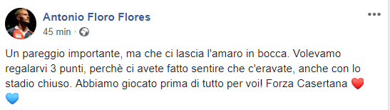 Questo il post apparso sulla pagina facebook ufficiale di Antonio Floro Flores, il giocatore della Casertana: