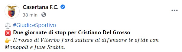 Questo quanto pubblicato sulla pagina fb della Casertana FC: "Giudice sportivo. Due giornate di stop per Cristiano Del Grosso. Il rosso di Viterbo - si legge nella nota - farà saltare al difensore le sfide con Monopoli e Juve Stabia"