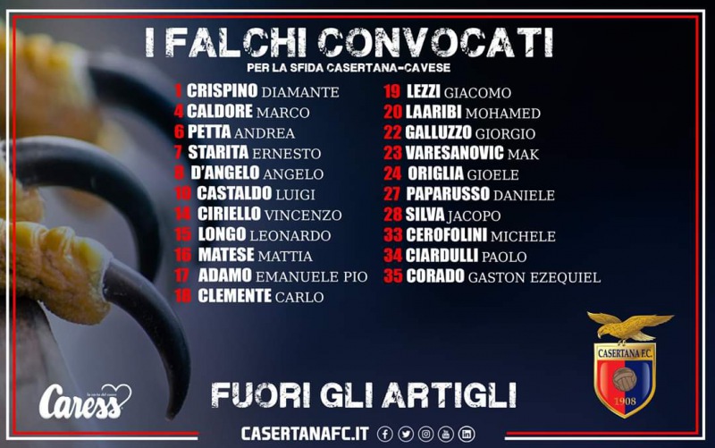 Questi i Falchi convocati per il match Casertana-Cavese: