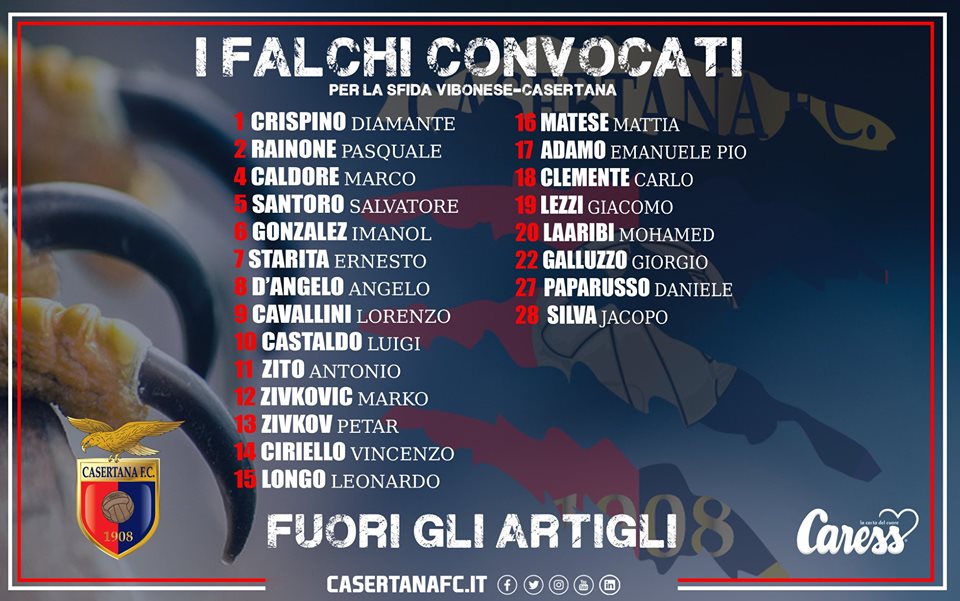 " FALCHI CONVOCATI PER VIBO VALENTIA. Sono 22 i rossoblu inseriti nella lista da mister Ginestra. Restano a casa gli infortunati Floro Flores, Origlia, Varesanovic e Lame."