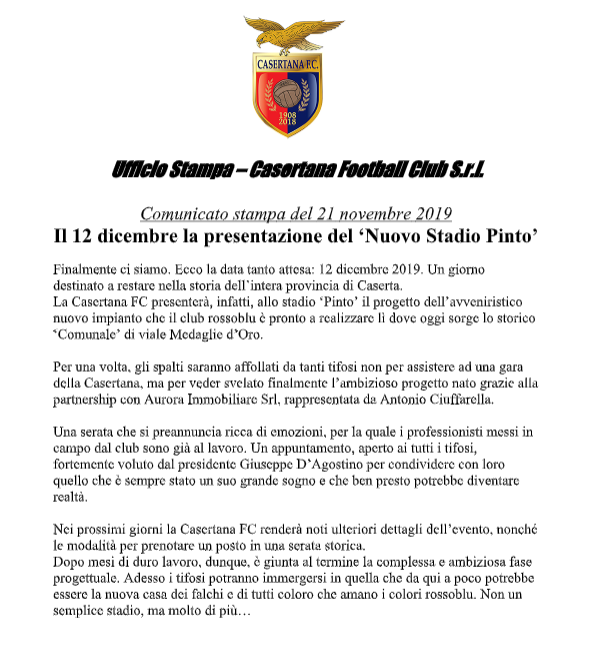 Di seguito, il testo del comunicato della Casertana, giunto in redazione.