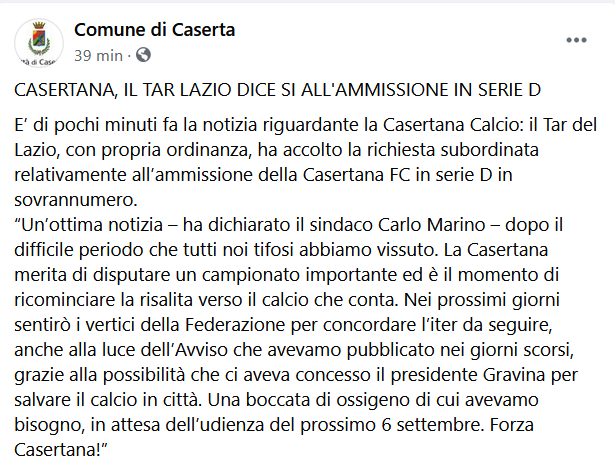 Questo il post pubblicato sulla pagina Facebook del Comune di Caserta: "E’ di pochi minuti fa la notizia riguardante la Casertana Calcio: il Tar del Lazio, con propria ordinanza, ha accolto la richiesta subordinata relativamente all’ammissione della Casertana FC in serie D in sovrannumero.“Un’ottima notizia – ha dichiarato il sindaco Carlo Marino – dopo il difficile periodo che tutti noi tifosi abbiamo vissuto. La Casertana merita di disputare un campionato importante ed è il momento di ricominciare la risalita verso il calcio che conta. Nei prossimi giorni - prosegue - sentirò i vertici della Federazione per concordare l’iter da seguire, anche alla luce dell’Avviso che avevamo pubblicato nei giorni scorsi, grazie alla possibilità che ci aveva concesso il presidente Gravina per salvare il calcio in città. Una boccata di ossigeno - conclude - di cui avevamo bisogno, in attesa dell’udienza del prossimo 6 settembre. Forza Casertana!”