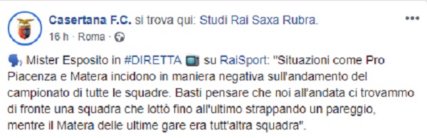 Questo il post pubblicato sulla pagina fb ufficiale della Casertana F.C.