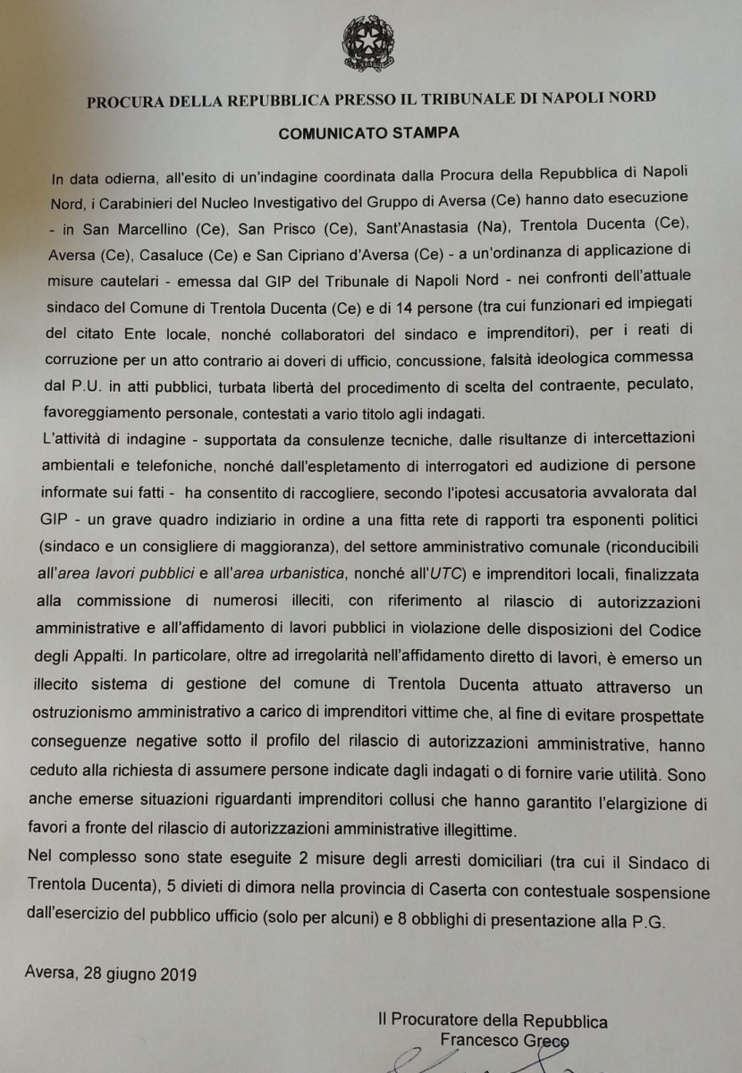 Il Comunicato Stampa inviatoci dalla Procura della Repubblica presso il Tribunale di Napoli Nord: