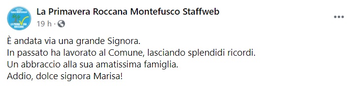 "È andata via una grande Signora. In passato ha lavorato al Comune, lasciando- si legge nella nota- splendidi ricordi. Un abbraccio alla sua amatissima famiglia. Addio, dolce signora Marisa!"