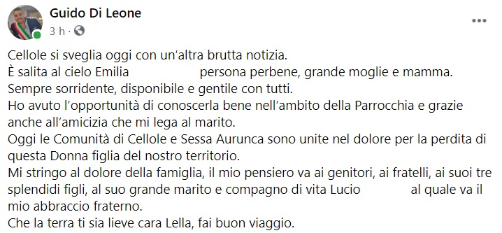 "Cellole si sveglia oggi con un’altra brutta notizia. È salita al cielo Emilia ... persona perbene, grande moglie e mamma. Sempre sorridente, disponibile e gentile con tutti. Ho avuto l’opportunità di conoscerla bene nell’ambito della Parrocchia e grazie- si legge nella nota- anche all’amicizia che mi lega al marito. Oggi le Comunità di Cellole e Sessa Aurunca sono unite nel dolore per la perdita di questa Donna figlia del nostro territorio. Mi stringo al dolore della famiglia, il mio pensiero va ai genitori, ai fratelli, ai suoi tre splendidi figli, al suo grande marito e compagno di vita Lucio ..., al quale- si legge nella nota- va il mio abbraccio fraterno. Che la terra ti sia lieve cara Lella, fai buon viaggio."