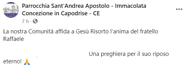 "La nostra Comunità affida a Gesù Risorto l'anima del fratello ... Raffaele... Una preghiera- si legge nella nota- per il suo riposo eterno!"