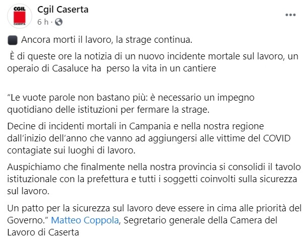 Questo il triste messaggio che apprendiamo dalla pagina facebook della Cgil Caserta: "Ancora morti sul lavoro, la strage continua. È di queste ore la notizia di un nuovo incidente mortale sul lavoro, un operaio di Casaluce ha perso la vita in un cantiere ... . “Le vuote parole non bastano più: è necessario un impegno quotidiano delle istituzioni per fermare la strage. Decine di incidenti mortali in Campania - si legge nella nota - e nella nostra regione dall’inizio dell’anno che vanno ad aggiungersi alle vittime del COVID contagiate sui luoghi di lavoro. Auspichiamo che finalmente nella nostra provincia si consolidi il tavolo istituzionale con la prefettura e tutti i soggetti coinvolti sulla sicurezza sul lavoro. Un patto per la sicurezza sul lavoro deve essere in cima alle priorità del Governo.” Matteo Coppola, Segretario generale della Camera del Lavoro di Caserta"