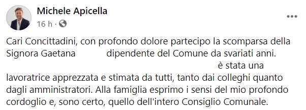 "Cari Concittadini, con profondo dolore partecipo la scomparsa della Signora Gaetana ..., dipendente del Comune da svariati anni. ... è stata una lavoratrice apprezzata e stimata da tutti, tanto dai colleghi quanto- si legge nella nota- dagli amministratori. Alla famiglia esprimo i sensi del mio profondo cordoglio e, sono certo, quello dell'intero Consiglio Comunale."