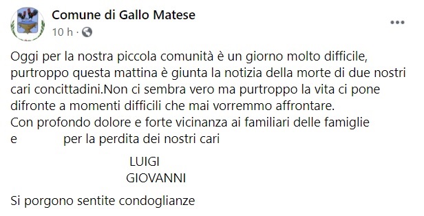 "Oggi per la nostra piccola comunità è un giorno molto difficile, purtroppo questa mattina è giunta la notizia della morte di due nostri cari concittadini. Non ci sembra vero ma purtroppo la vita ci pone difronte a momenti difficili che mai vorremmo affrontare. -Si legge nella nota- Con profondo dolore e forte vicinanza ai familiari delle famiglie ... per la perdita dei nostri cari ... LUIGI ... GIOVANNI Si porgono sentite condoglianze"